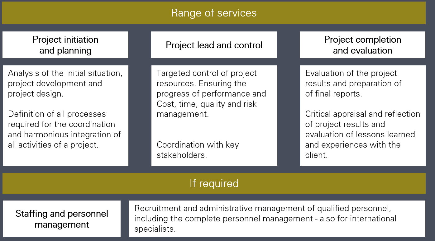 Specific subject knowledge and project management resources of the necessary quality are not always flexibly available in the company. It makes sense to have access to targeted services that support the achievement of project goals. Fast, uncomplicated, transparent and of high quality.