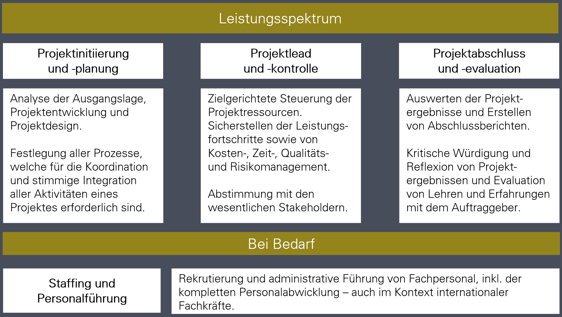 Nicht immer sind spezifisches Themenwissen und Projektmanagementressourcen in der notwendigen Qualität flexibel im Unternehmen verfügbar. Da ist es sinnvoll, wenn auf gezielte Dienstleistungen zurückgegriffen werden kann, welche die Erreichung der Projektziele unterstützen. Schnell, unkompliziert, transparent und von hoher Qualität.